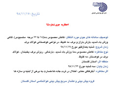 به گزارش خبرگزاری صداوسیما مرکز گلستان؛ بر اساس این اطلاعیه، از بعدازظهر امروز با فعالیت سامانه ناپایدار در استان، بارش باران و برف، گاهی وزش باد شدید، طوفانی شدن دریا، مه غلیظ، یخبندان و در ارتفاعات کولاک برف پیش بینی می‌شود.