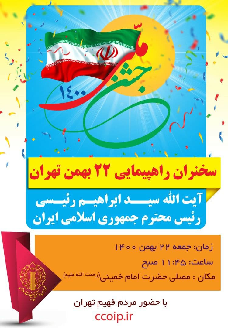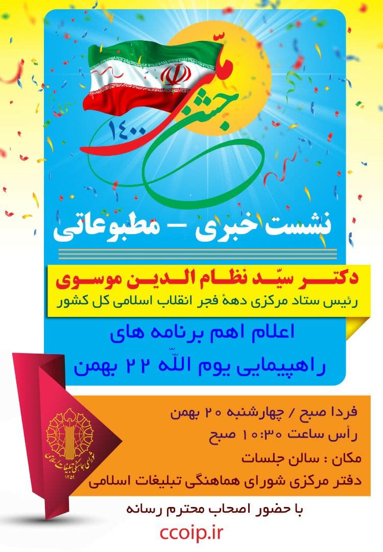 شورای هماهنگی تبلیغات اسلامی از ملت بزرگوار و سربلند ایران اسلامی میخواهد تا بار دیگر در آستانۀ چهل و سومین سالگرد پیروزی افتخارآفرین و شکوهمند انقلاب اسلامی بانگ الله اکبر سر داده و انسجام خود را با زنده نگاه داشتن یاد و خاطره شهدای گرانقدر انقلاب اسلامی و تجدید میثاق با آرمانهای والای حضرت امام خمینی «رحمت الله علیه» و بیعت مجدد با رهبر معظم انقلاب حضرت آیت الله العظمی امام خامنهای «مدظله العالی» به اثبات برسانند و در راستای اطاعت از فرامین رهبری و حفاظت از دستاوردهای سترگ انقلاب اسلامی لحظهای از پای ننشینند.