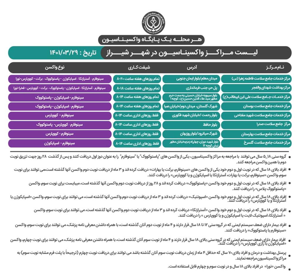در راستای تحقق شعار «هر محله_یک پایگاه واکسیناسیون» مردم شهر شیراز می‌توانند برای دریافت واکسن به مراکز خدمات جامع سلامت زیر و یا پایگاه‌های تجمیعی واکسیناسیون، بر اساس جدول زیر مراجعه کنند.