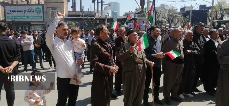 مردم سردشت در حمایت از حملات پهپادی و موشکی سپاه پاسداران انقلاب اسلامی به رژیم صهیونیستی، در میدان صلاح الدین ایوبی این شهر تجمع کردند.