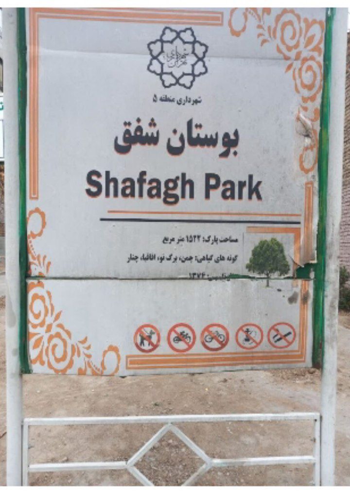 ۲_بوستان شفق ازضلع جنوبی به خیابان شهیدان صفویان وازضلع شمالی به کوچه شهیدبهرام دهزویی ازضلع غربی ب کوچه بهشت وازشرق به فضای بی دفاع شهری منتهی شده!